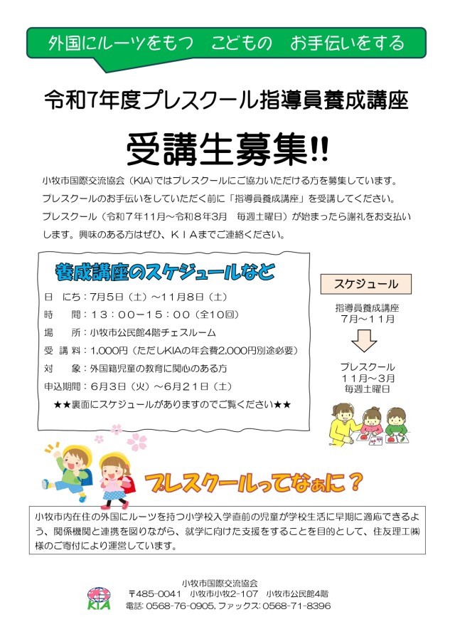 プレスクール指導員養成講座受講生募集≪申込み6月3日(火)~6月21日(土)≫